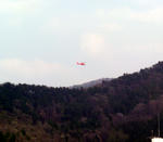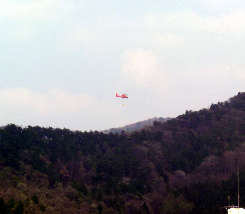 盃山上空を、放水ヘリが飛んでいます。